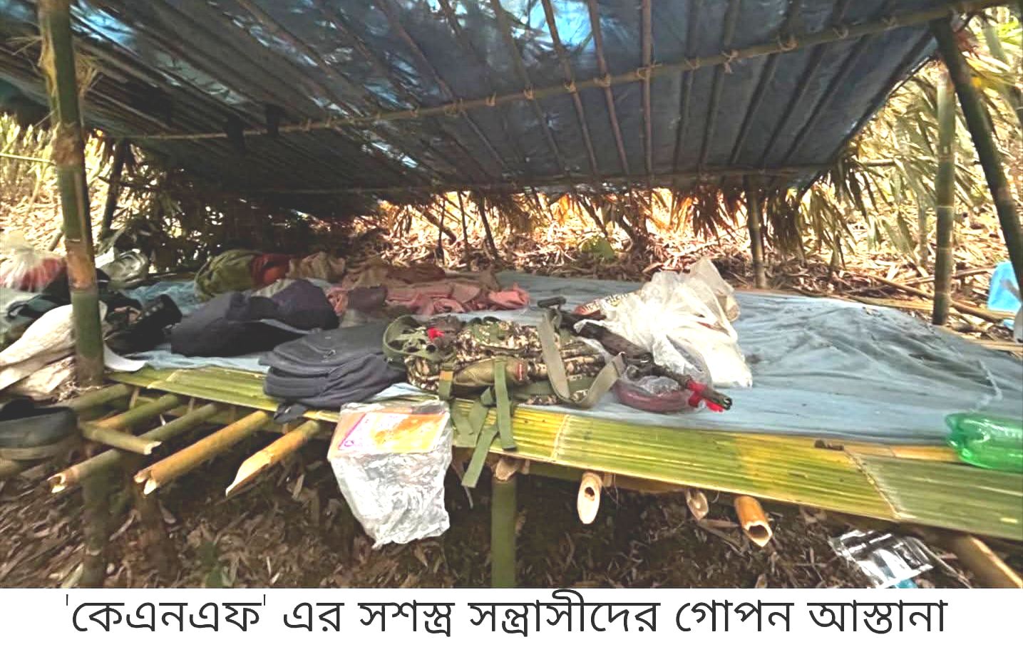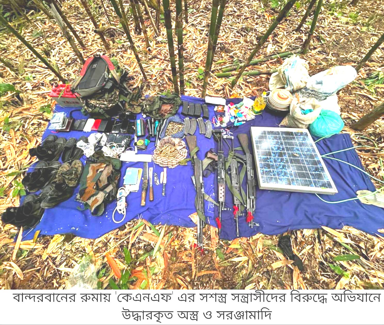 ‎অভিযান শেষে ঘটনাস্থল থেকে ৩টি সাবমেশিনগান (SMG), ১টি রাইফেল, বিপুল পরিমাণ গোলাবারুদ, অস্ত্রের ম্যাগাজিন, কেএনএফ-এর ব্যবহৃত ইউনিফর্ম এবং গুরুত্বপূর্ণ নথিপত্র উদ্ধার করা হয়।