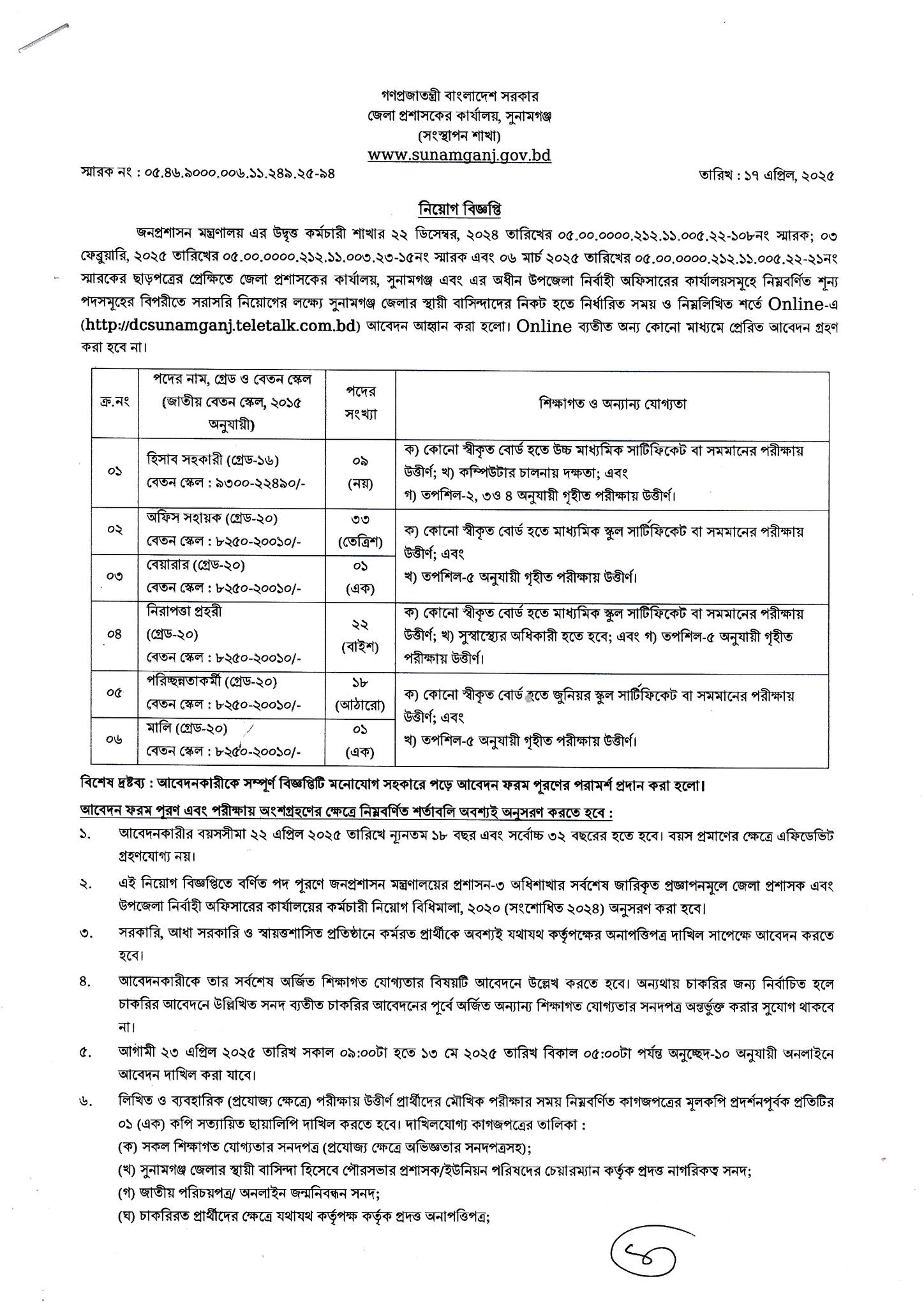 সুনামগঞ্জ জেলা প্রশাসক কার্যালয়ের নিয়োগ বিজ্ঞপ্তি