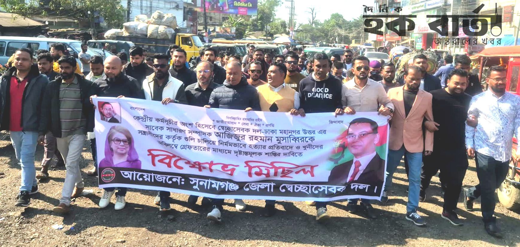 মুসাব্বির হত্যার প্রতিবাদে সুনামগঞ্জে জেলা স্বেচ্ছাসেবক দলের বিক্ষোভ ও সমাবেশ